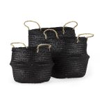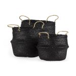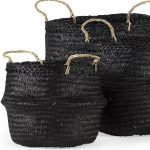 This Set of Three Black Wicker Storage Baskets is the perfect way to add rustic design and practicality to your home. There are three baskets in this set that are made from wicker and have a braided design all over in a stunning black color. Around the middle of each basket there is a heavier wicker stripe that adds a 3D element to the look of these baskets. The handles on either sides of these baskets are braided wicker and have a light brown finish on them. This set has vaying sizes of baskets allowing you to use them for whatever purpose you need. These simple wicker baskets are great to store your blankets in the living room, or toys in the children’s room. You can keep your home clutter free all the while adding some design to it as well. 11.02″ H x 9.84″ W x 9.84″ D